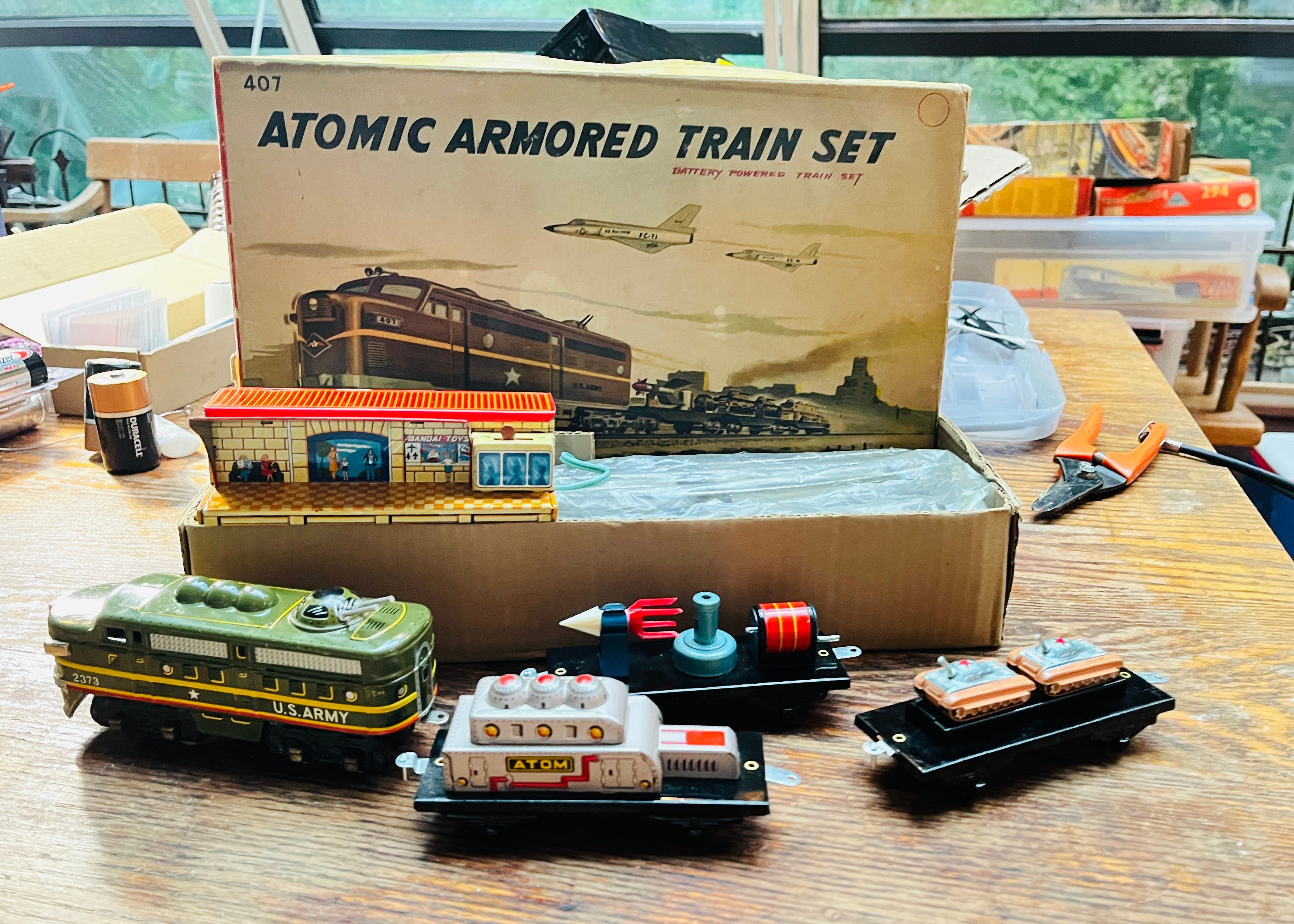 An "atomic" theme is featured in a surprising number of post-war Japanese toys. Bandai’s battery operated Atomic Armored Train includes a nuclear reactor, tanks, missiles, 8 sections of track, and a train station populated with civilians seemingly unconcerned with the Army's nuclear capability or proximity.